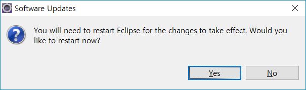 설치가 완료되면 Eclipse(이클립스)를 다시 시작하겠다는 메시지가 나타납니다. [Yes]를 클릭하여 Eclipse(이클립스)를 재시작합니다.