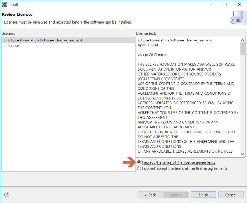 화살표 위치의 라이센스 동의 항목을 선택하고 [Finish]를 클릭합니다.