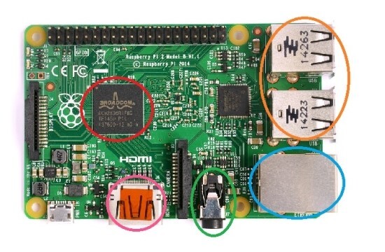 보드의 프로세서는 BCM2836 이며, 음향, 영상, USB, 이더넷 및 HDMI 등을 지원합니다.