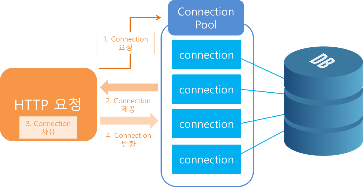 - 웹 컨테이너(WAS)가 실행되면서 일정량의 Connection 객체를 미리 만들어서 pool에 저장했다가, 클라이언트 요청이 오면 Connection 객체를 빌려주고 해당 객체의 임무가 완료되면 다시 Connection 객체를 반납 받아서 pool에 저장하는 프로그래밍 기법이다.