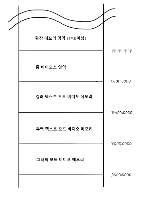 16비트 세그먼트:오프셋 방식으로 표현할 수 있는 주소는 0000:0000 ~ FFFF:FFFF입니다. 이 중 모두를 RAM이 사용하는 것이 아니라, 다른 주변장치에도 주소가 할당되어 있습니다. 어느 기기에 어느 주소가 할당되었는지에 대한 분포를 나타낸 것을 메모리 맵이라 합니다.