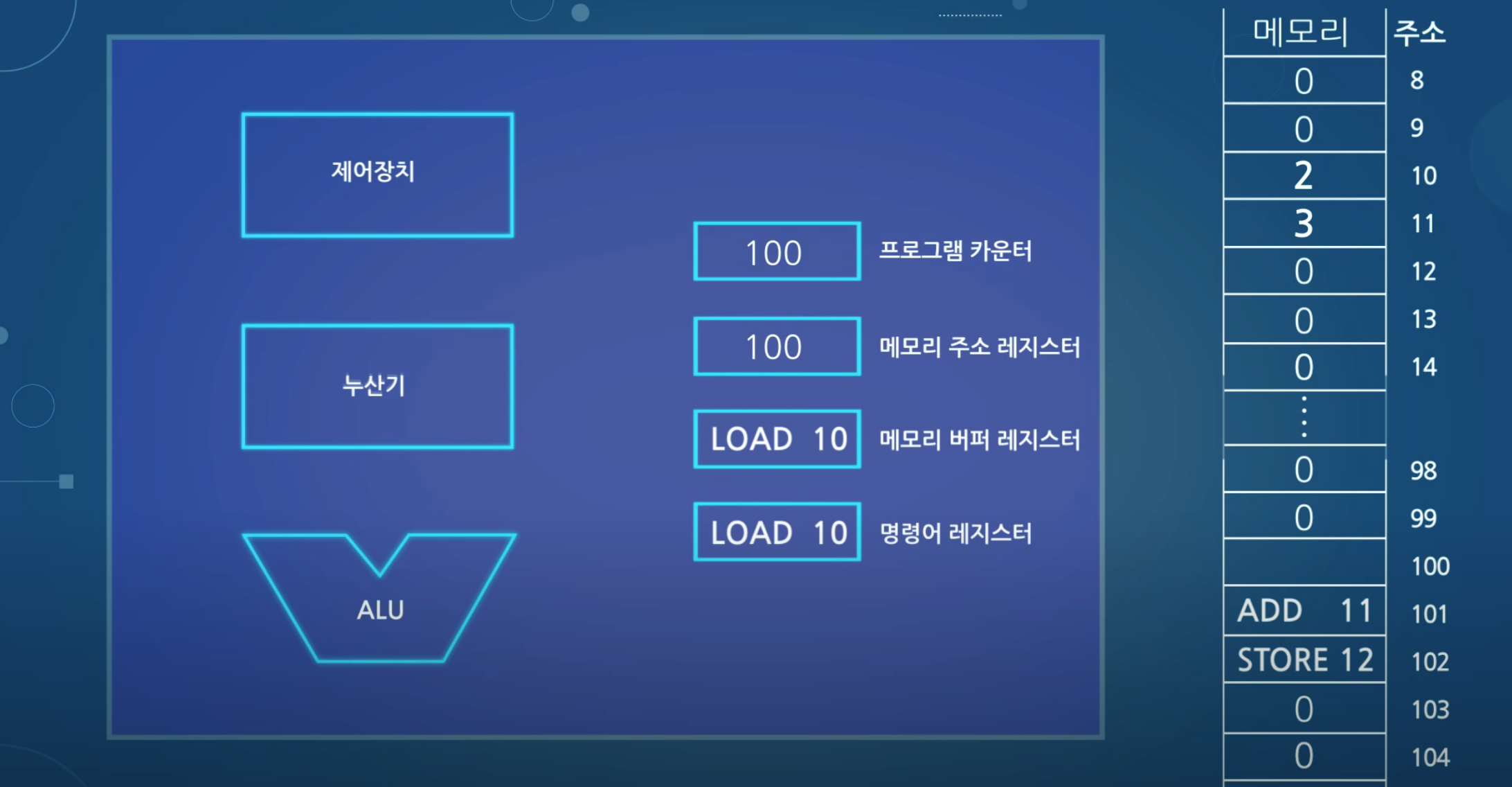 10번 주소의 값은 명령어가 아닌 값(2)이므로 누산기 레지스터에 저장됨