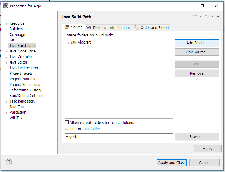 다음에 왼쪽의 Java Build Path를 누른 뒤에 Source 탭으로 들어가 Add Folder를 눌러주자