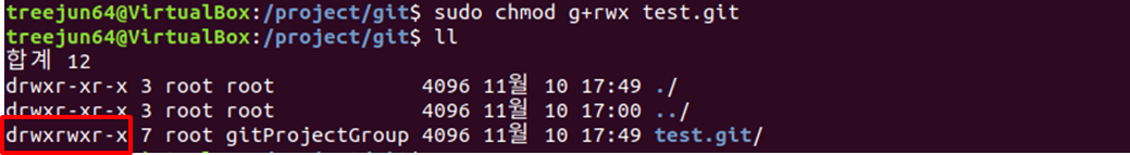 // test.git 레파지토리에 대한 그룹 권한 rwx로 변경